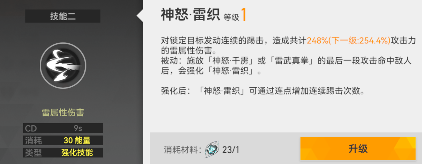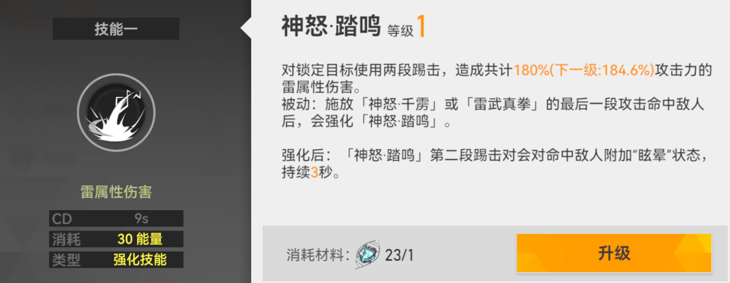 对目标使用两段踢击造成雷属性伤害,当雷獠上一个使用的技能为【神怒·千雳】或【雷武真拳】第四段时,会强化【神怒·踏鸣】,强化后【神怒·踏鸣】第二段命中的敌人会被附加三秒的眩晕。