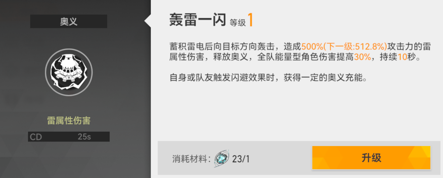 对目标造成雷属性伤害,并且全队能量型角色伤害提高30%,持续10秒。自身或队友触发闪避效果可获得奥义充能。这个奥义极其难命中,遇到跑来跑去的敌人,你就当没它吧。