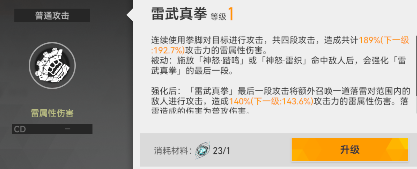 对目标连续造成4段攻击,当角色上一个使用的技能为【神怒·踏鸣】或【神怒·雷织】时,会强化普通攻击第四段,强化后攻击目标会额外触发一道雷属性范围攻击,视为普攻伤害。