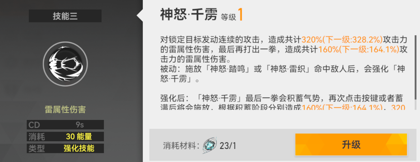 对目标发动连续的拳击,最后打出一拳额外造成雷属性伤害。当雷獠上一个使用的技能为【神怒·踏鸣】或【神怒·雷织】时,会强化【神怒·千雳】,强化后最后一拳会蓄力,蓄力的三个阶段分别可以造成1倍、2倍、4倍的伤害。