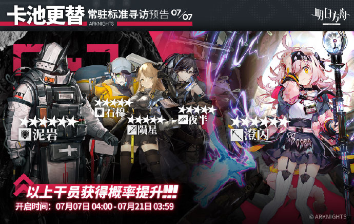 本次7月上旬即将开启的常驻标准寻访卡池,起止时间:07月07日04:00 ~ 07月21日03:59,具体涉及到的干员UP包括六星术士澄闪,六星重装泥岩,五星重装石棉、五星狙击陨星、五星先锋夜半,其中不出意外的话,开放兑换的干员是泥岩还有陨星。