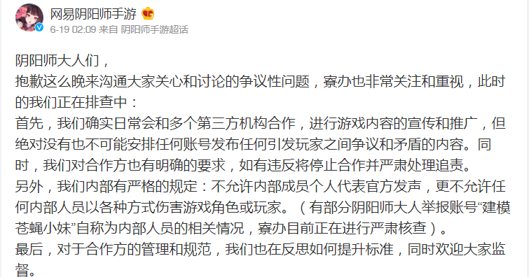 “网易阴阳师手游”表示,其确实日常会和多个第三方机构合作,进行游戏内容的宣传和推广,但绝对没有也不可能安排任何账号发布任何引发玩家之间争议和矛盾的内容。同时,对合作方也有明确的要求,如有违反将停止合作并严肃处理追责。