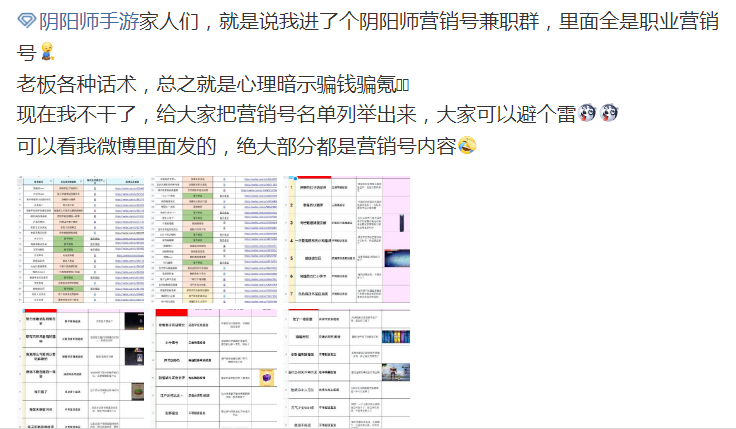 起因是在6月17号的时候,一位微博用户发博表示,自己之前进了阴阳师的营销号兼职群,现在自己不做了以后,公开这件事和营销号名单,以及营销号的话术,希望大家避雷。