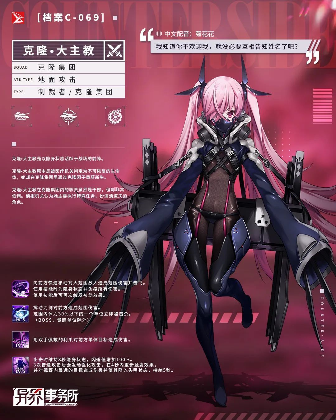 克隆.大主教原本是被医疗机关判定为不可恢复的生命体,她却在克隆集团里通过克隆因子重获新生。克隆.大主教在克隆集团内的职责虽然是干部,但却非常低调。情报机关认为她主要执行特殊任务,扮演清道夫的角色。