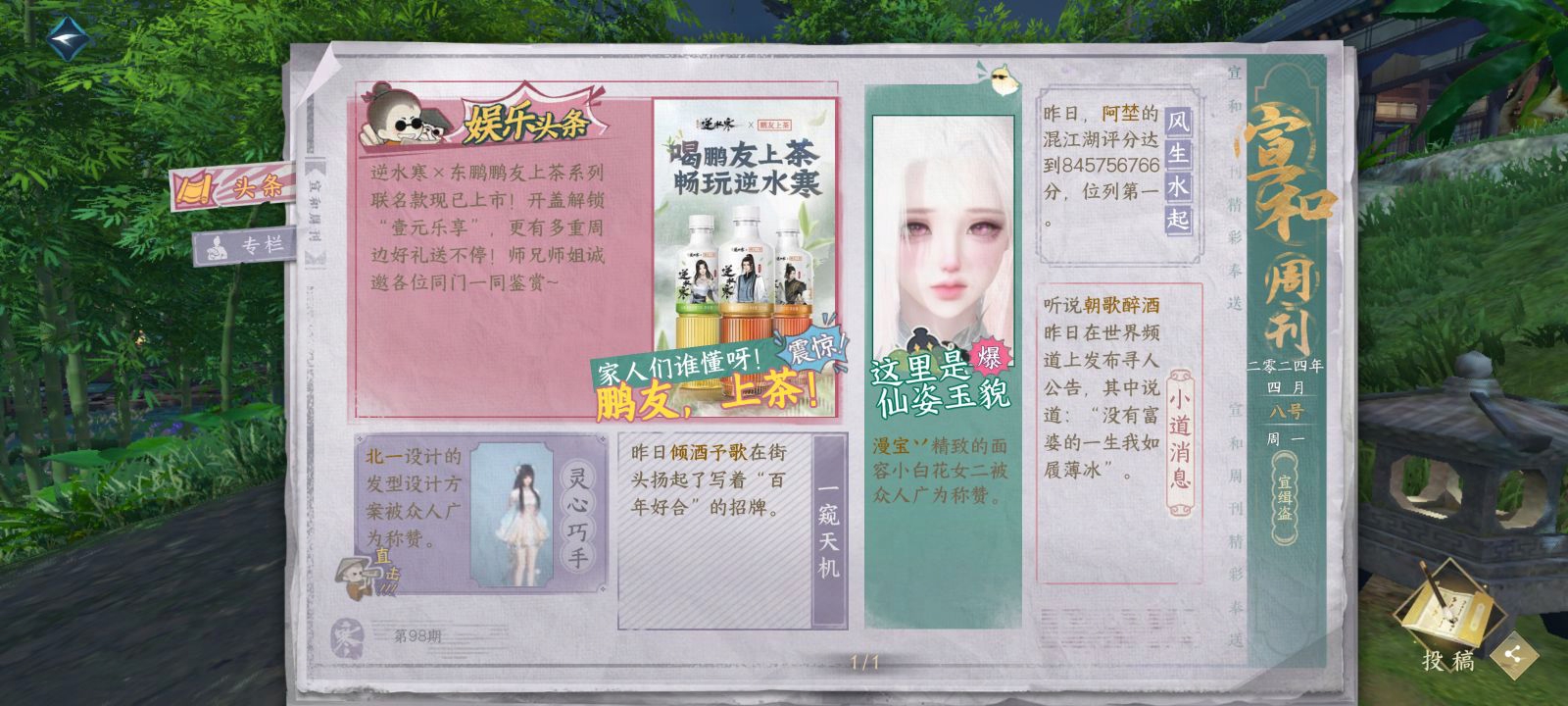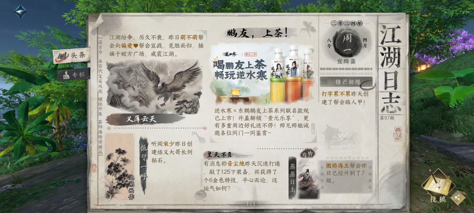 喝鹏友上茶,畅玩逆水寒!游戏内,喝茶的风潮也席卷了江湖,大宋头条、宣和周刊和江湖日志上,都能见到“鹏友上茶”的身影!
