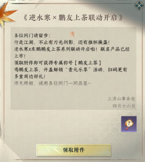 小寒也为各位同门准备好了本次联动的全新专属称号【鹏友,上茶!】,大家上线后点开邮箱就能领取啦!