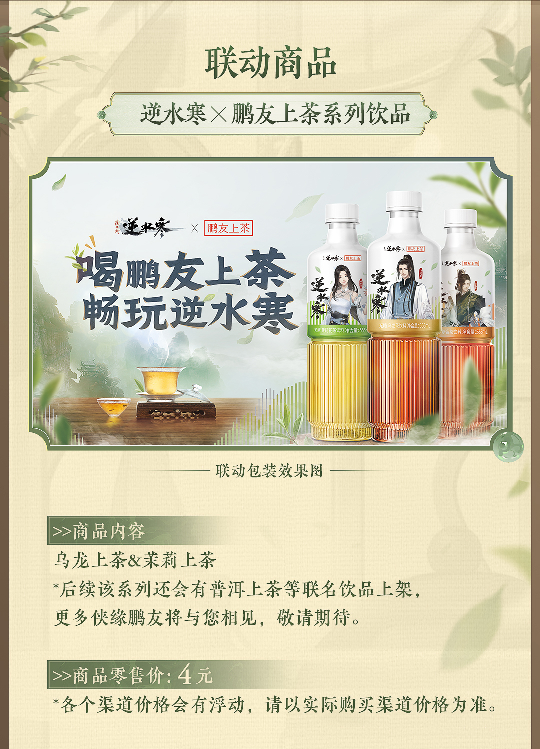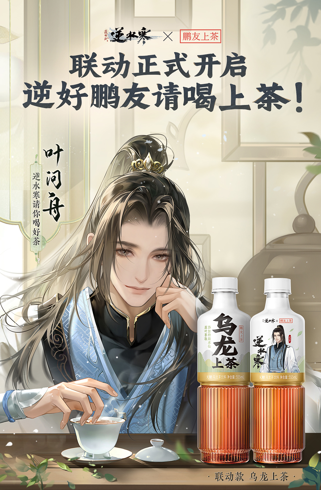 国风游戏顶流游戏逆水寒与实体产业巨头东鹏饮料集团共同推出联名款“鹏友上茶”,让在畅游逆水寒的江湖世界时,一同品味到这款联名茶饮的醇厚口感,领略传承千年的茶香意境。