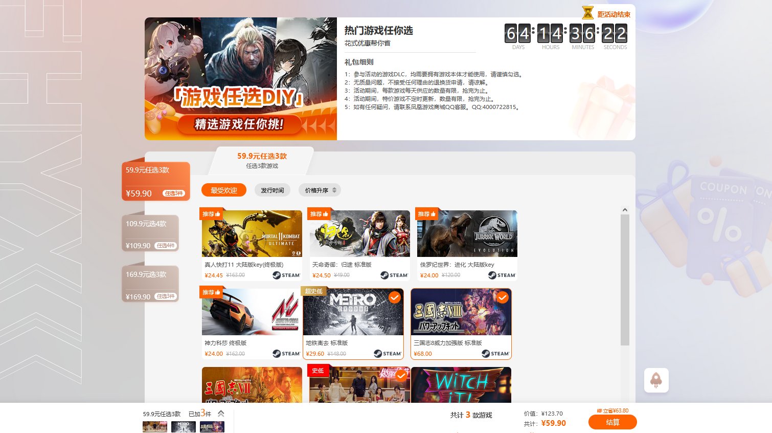 《三国志7》威力加强版、《三国志8 威力加强版》、《地铁离去》、《做你的猫》、《疯狂运输》、《煮糊了2》等任意三款游戏仅需59.9元。
