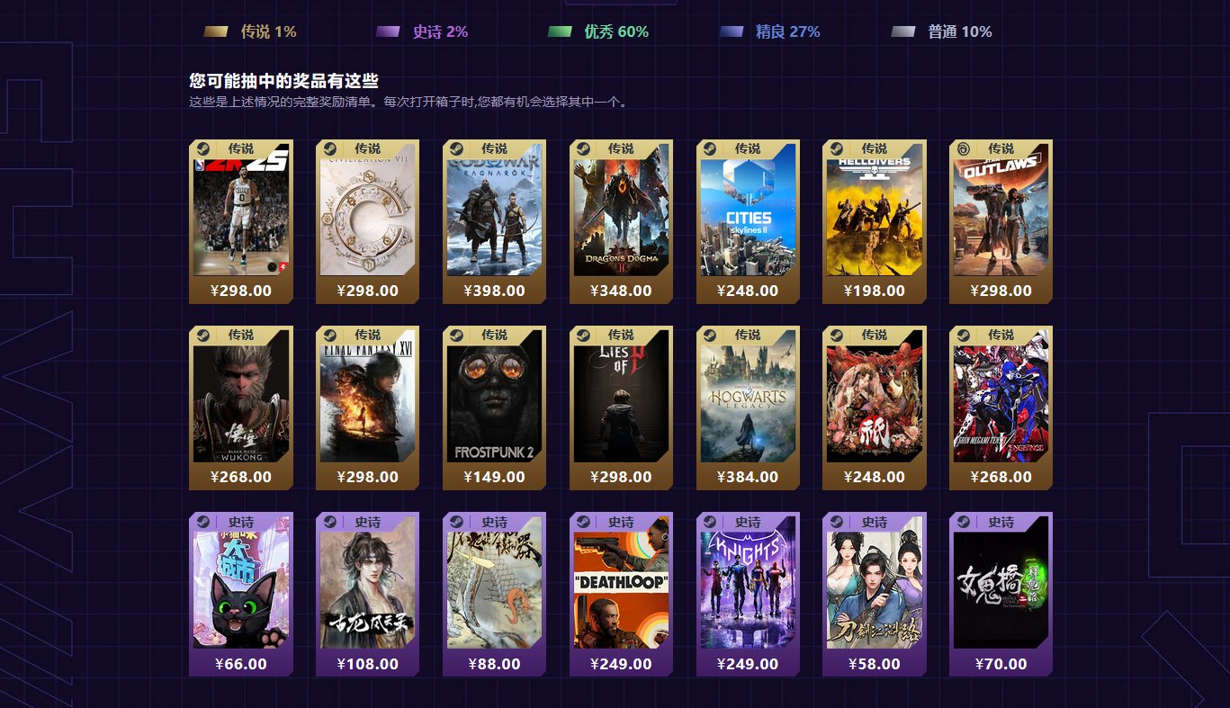 19.9元有机会抽取《NBA2K25》《文明7》《战神:诸神黄昏》《黑神话:悟空》《最终幻想16》等诸多大作。