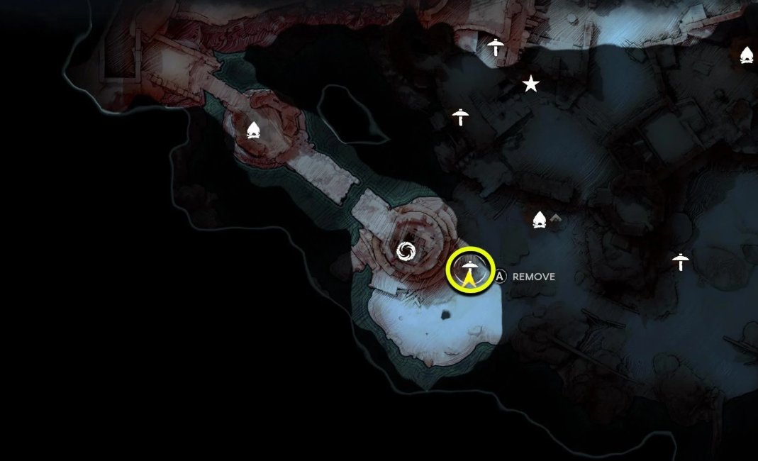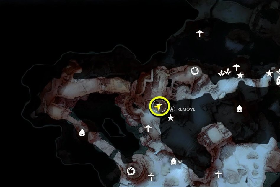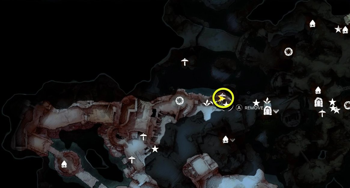 然后沿着矿点右侧的墙壁往南走,爬上模板,再向北走到藤蔓所在地方,爬上栏杆跳过缺口,激活水手寨低语。