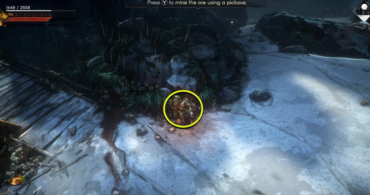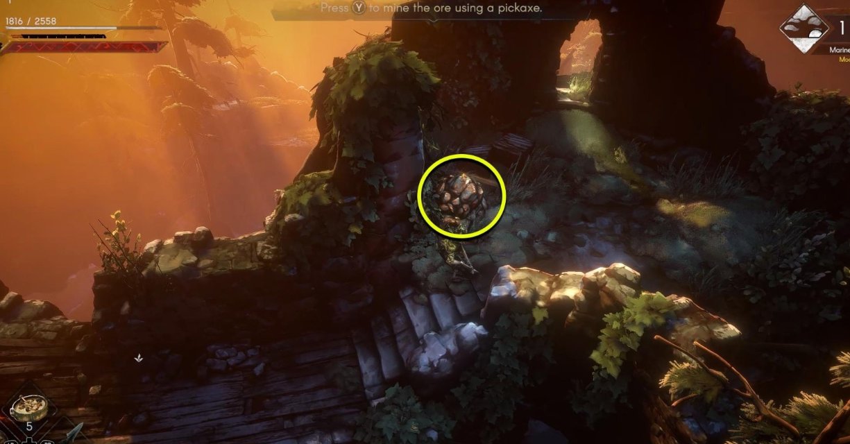 从低语翻过栏杆,沿着破损的木制平台往东走,在道路尽头的下一个房间的楼梯顶端可以看到第六处铜矿石点。