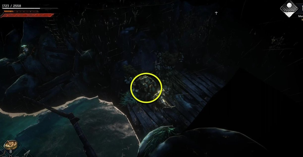 回到浅滩低语,往北走可以看到一些木板,沿着木板走到横梁为止,跳进东边的洞里即可看到。