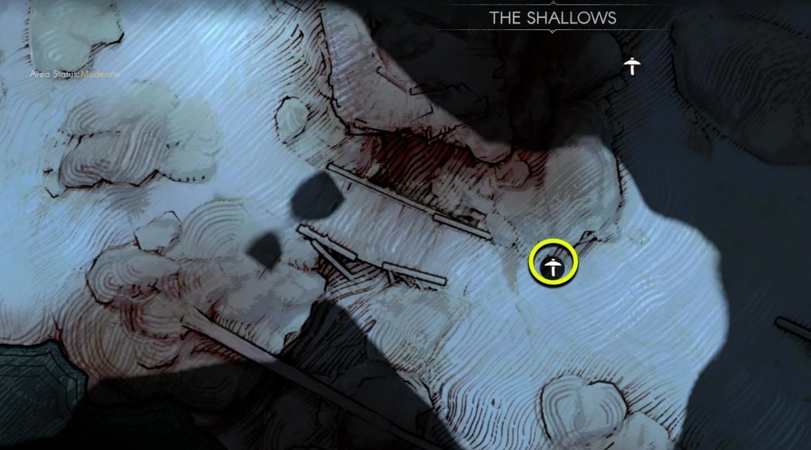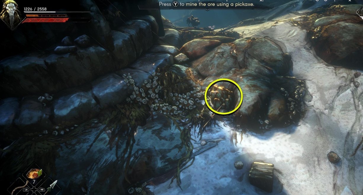 从浅滩低语出口向南走,沿着塔的边缘逆时针走,在塔和棕色岩石之间有第一个铜矿石点。