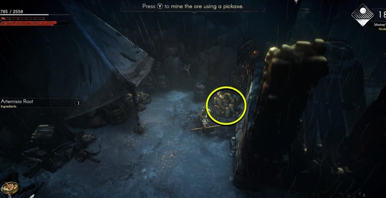 跳回横梁上,继续往北走,往上爬两个梯子 ,从第二个梯子顶端往东进入旁边的房间,在房间后面的帐篷旁可以看到第五个铜矿石点。