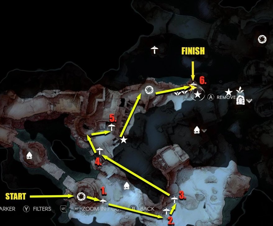 下图介绍的刷铜矿石路线从地图最东南边的浅滩区域的低语出发,如果从圣城出发的话按着下图路线反向即可。按照这条路线刷的话大约一次可以获得十几块铜矿石。由于本作地图中的敌人会不断变化刷新,所以本文不会提到路线中遇到的敌人。因此在出发前确保带好治疗食物,至少两把铜镐,或者一把铁镐。