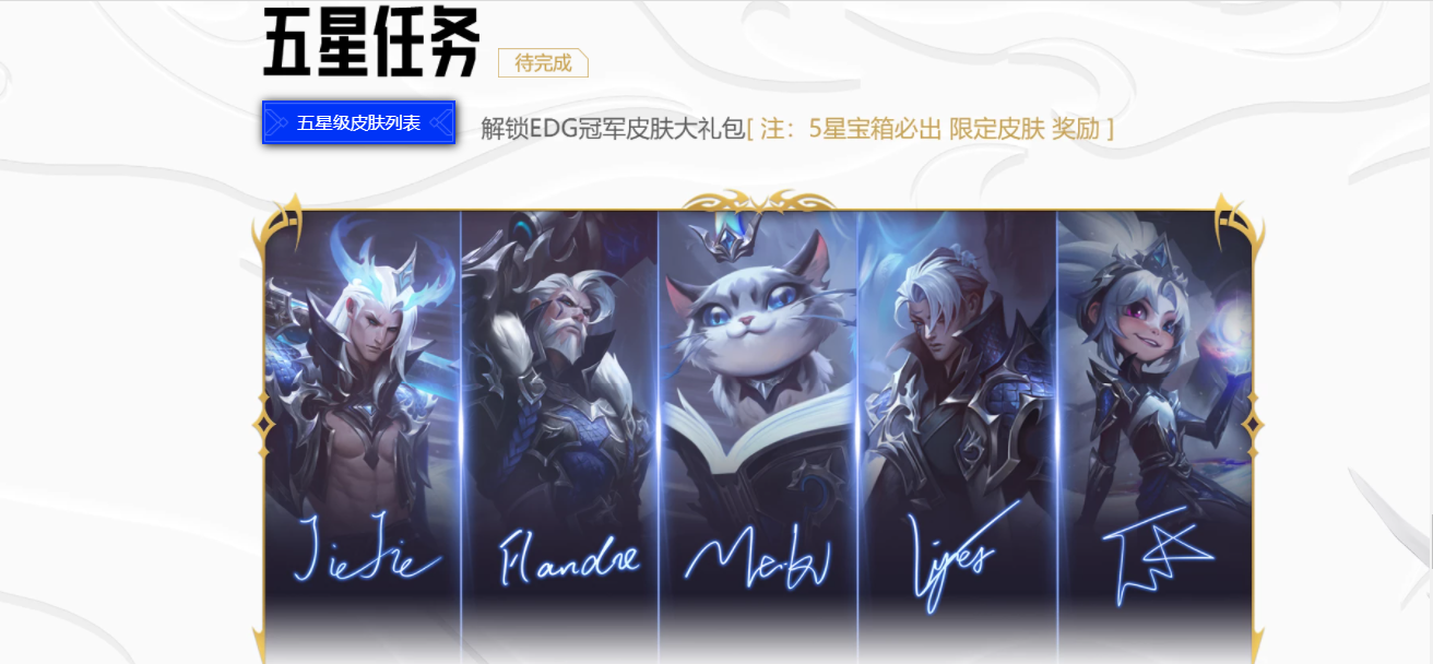 完成初始任务可以解锁冠军荣耀宝箱,开启荣耀宝箱可以随机获得一款奖池中优先没有拥有的皮肤,奖池的品质会根据你完成的不同星级的任务进行提升的,完成五星必得限定皮肤。