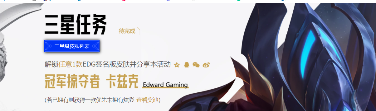 解锁任意1款 EDG签名版冠军皮肤,并分享活动。注意是购买签名版也就是11900点券的。
