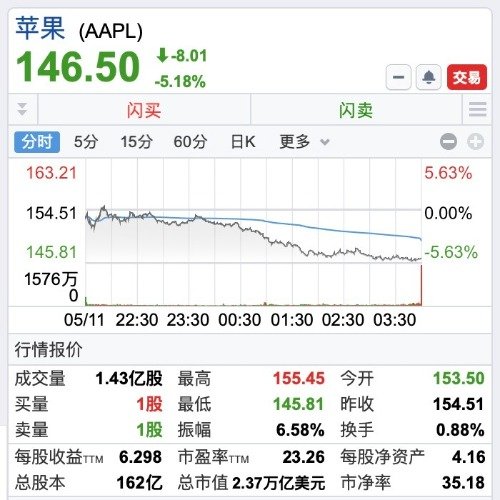 苹果大跌5.18%,一夜之间1296亿美元市值蒸发,新总市值为2.37万亿美元,总市值失去全球第一宝座。