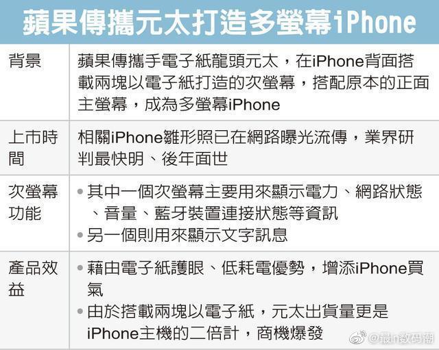 5月9日,业界传出,苹果携手电子纸龙头元太,在iPhone背面搭载两块以电子纸打造的次屏幕,搭配原本的正面主屏幕,成为多屏幕iPhone,借由电子纸护眼、低耗电优势,增添iPhone吸引力。相关iPhone雏形照已曝光流传,业界研判离上市之路不远,最快明、后年面世。