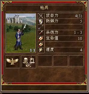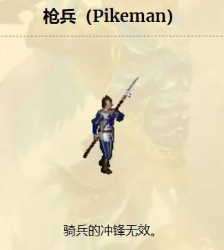 城堡的一级兵,枪兵,在游戏中看起来似乎是一个没啥用处的白板兵种,但在战斗中,他却能抵抗白骑冲锋所带来的伤害加成。这也是全游戏中唯一能够抵挡骑兵冲锋伤害的兵种。
