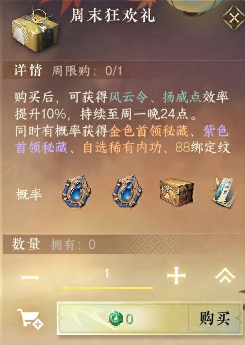 抛开工作日的烦恼,享受周末的狂欢时刻!1.3.2版本更新之后,商城每周六零点上新周末狂欢礼,售价0纹玉。购买后可以获得风云令、扬威点效率提升10%,持续到周一24点。同时有概率抽取到金色首领打造材料、紫色首领打造材料、寻侠帖、88绑定纹玉、30000交子等多种奖励。