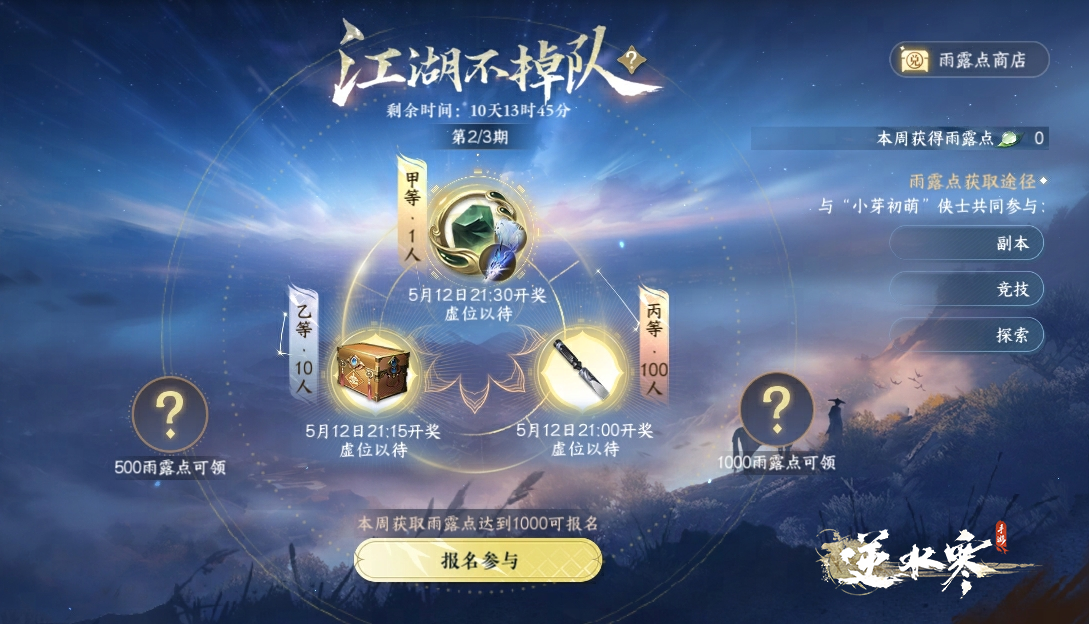 好的江湖,当然要让玩家们都跟上大部队,一起体验游戏的欢乐!4月29日到5月19日期间,每周获得500雨露点的玩家,将触发额外福利,可获得交子、绑定纹玉、玉华染等好礼。而获得1000雨露点时,除了再次触发额外福利,更是能参与周日晚的抽奖,有机会获得鉴石神凿·绑、【自选】稀有内功、天赏石等豪礼!