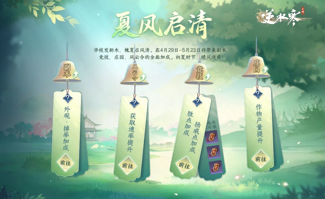 春夏之交,带有好运加成buff的清风也吹进了逆水寒!1.3.2版本更新后,4月29日到5月23日期间,夏风启清全服加成活动正式开启,期间参与副本外观获取加成、PVP胜点加成(可领取道具)、庄园作物产量加成、全服风云令效率提升20%!