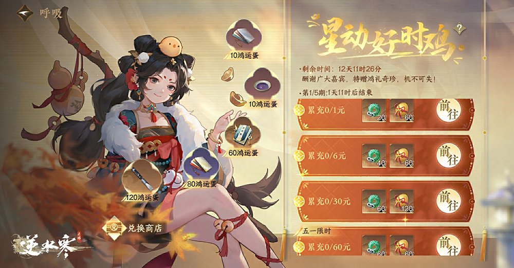 鸿运蛋一开,福气自然来!本次充值活动将于4月26日10点开启,持续至5月13日5点结束,本次活动共5期。