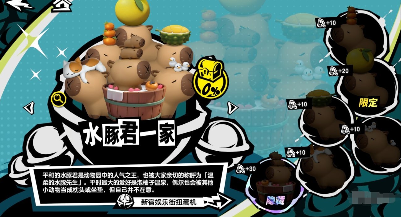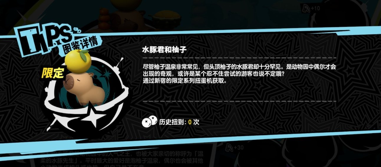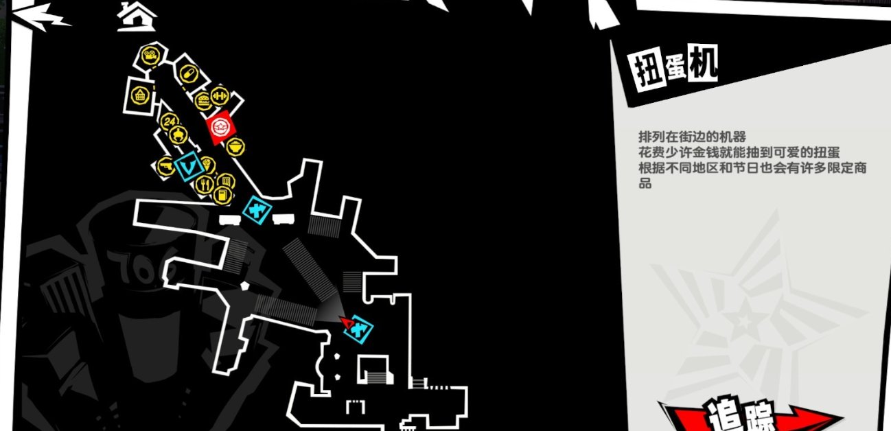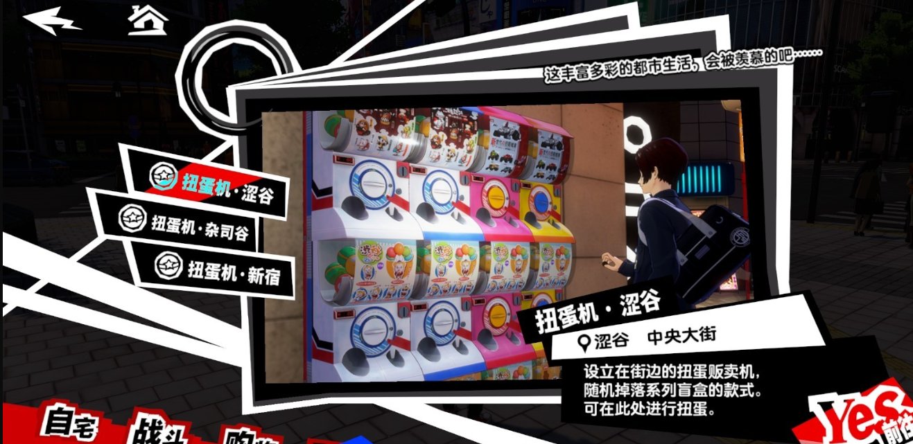 在街边排列的扭蛋贩卖机中投入硬币,就会掉落扭蛋模型,不同地区会有不同的限定款式。目前版本扭蛋机位于三个地区:涩谷、杂司谷和新宿。完成支线任务引导并解锁扭蛋机后,即可在左上角地图下方点击对应地区的扭蛋机快速传送。