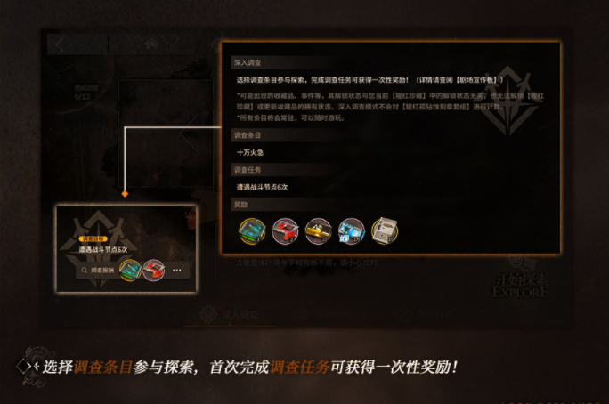 选择调查条目参与探索,首次完成调查任务可获得一次性奖励。