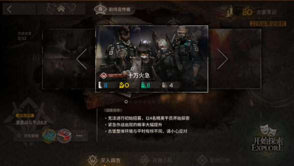 【深入调查】是有别于【常规行动】的独立模式,在【常规行动】中完成游戏结局一次后即可解锁【深入调查】。