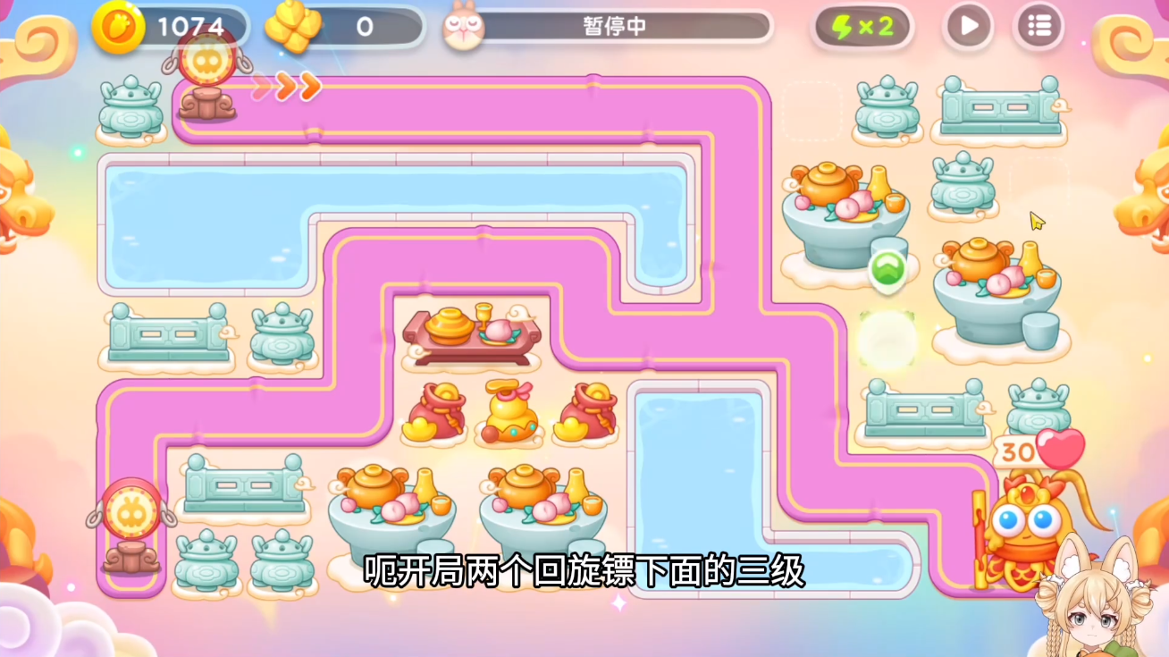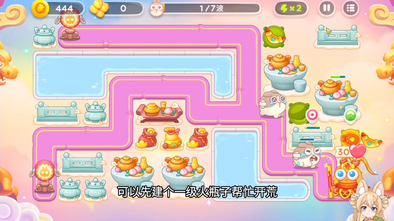1、首先开局先建两个回旋镖,依次锁定香炉和栅栏,兔子来了先打兔子。