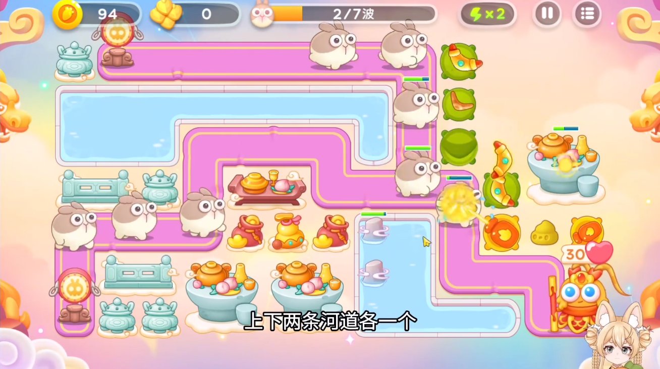 3、注意第二波开始河道里会开始冒出道具,其中两个道具藏有荷叶,上下两条河道各一个。