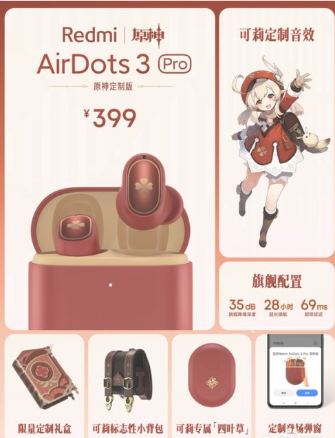 联名耳机新品售价399元,目前已经开售,Redmi带来了Redmi AirDots 3 Pro原神可莉联名版。