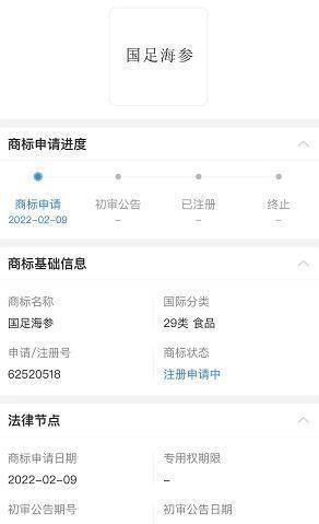 据相关平台显示,“国足海参”商标日前被抢注,国际分类涉29类食品,当前商标状态为“注册申请中”。
