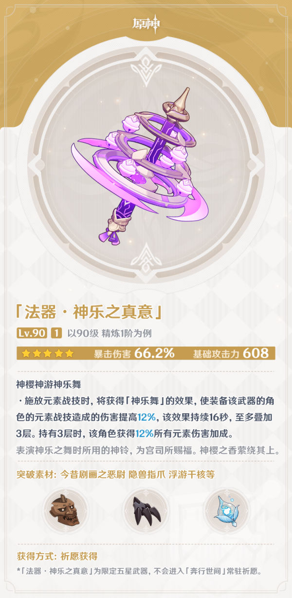 重点在于武器特效,想要吃到12%的元素增伤,就必须在12秒内叠满3层神乐舞,也就是12秒内放3次元素战技。除了八重神子,目前还没有法师角色能做到,除非可莉、1命砂糖、2命凝光带赌徒套。