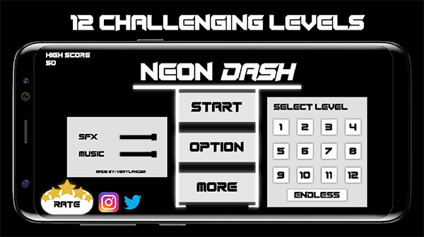 霓虹冲刺Neon Dash是一款平台跳跃冒险游戏,控制一个小方块不断向前,在霓虹灯构成的世界中不断向前,避开危险的障碍,借助灵敏的反应力来跳跃至平台之上,直至到达终点。到达终点后你将面对强大的boss,挑战自己并击败它。