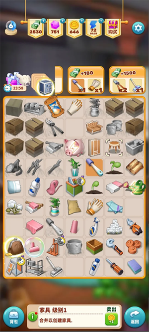 合并与装修是一款休闲合并装修模拟游戏,扮演成为设计师凯洛琳,发挥你的创意和设计天赋,帮助好友设计新家。游戏玩法很简单,玩家通过简单合并来将装修材料进行合成,收集钱币和道具,推动剧情并完成装修任务。