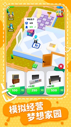 完成更多的经营任务,将房屋打造更加豪华,能够让你售卖掉的价格更高,轻松体验。