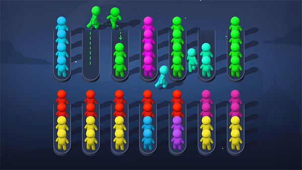 火柴人排序Sort Puzzle stickman games是一款极具挑战性的排序游戏,玩法经典,不仅可以为你带来乐趣,还可以锻炼大脑。在游戏中,玩家需要将不同颜色的火柴人进行分类,制作不同队列中的火柴人都是相同的颜色。