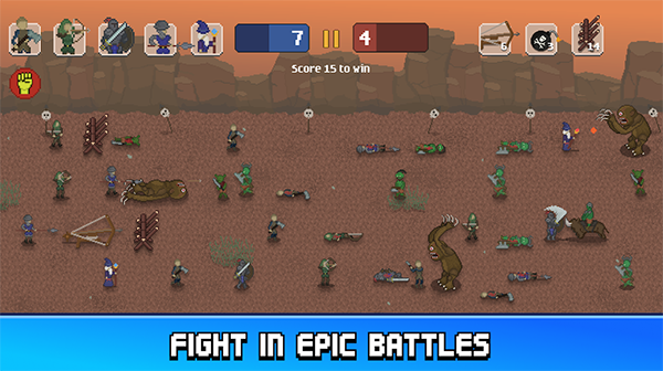 解锁人类、半兽人和精灵王国的部队。招募最佳的部队类型,使您的像素军队多样化