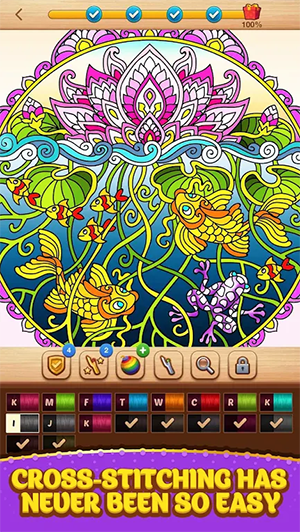 十字绣着色曼陀罗Cross Stitch Coloring Mandala是一款十字绣益智模拟游戏,发现1000多种免费的曼陀罗图案,享受十字绣dial的乐趣。游戏中,玩家可以通过十字绣来与朋友和家人分享你的杰作,游玩该游戏可以提高你的注意力。