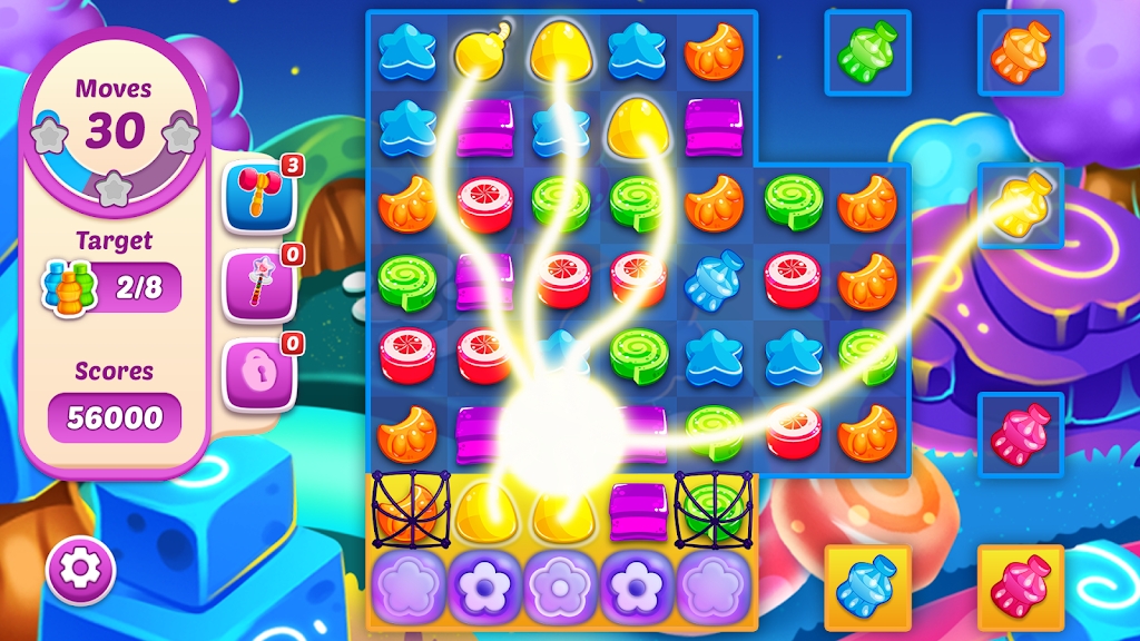 加入啫喱王国历险,粉碎所有多汁的水果,收集更多星星,解锁全新关卡,享受糖果爆炸三消带来的乐趣