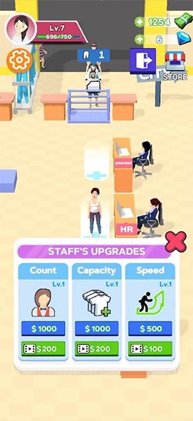 提高您的英雄技能!前往经理办公桌以提高速度并升级您的英雄以更快地洗衣服