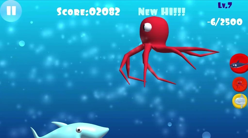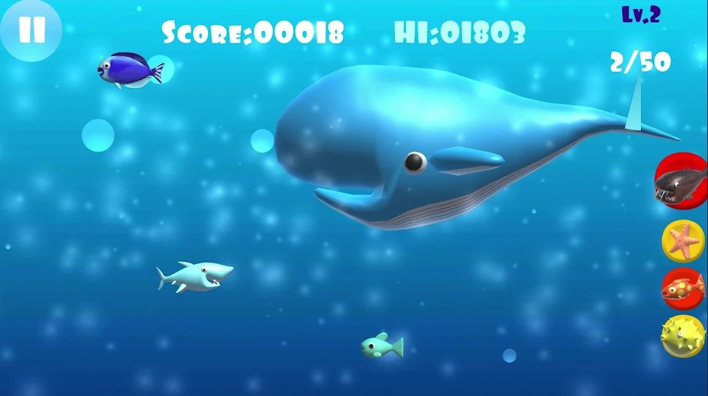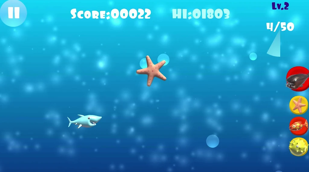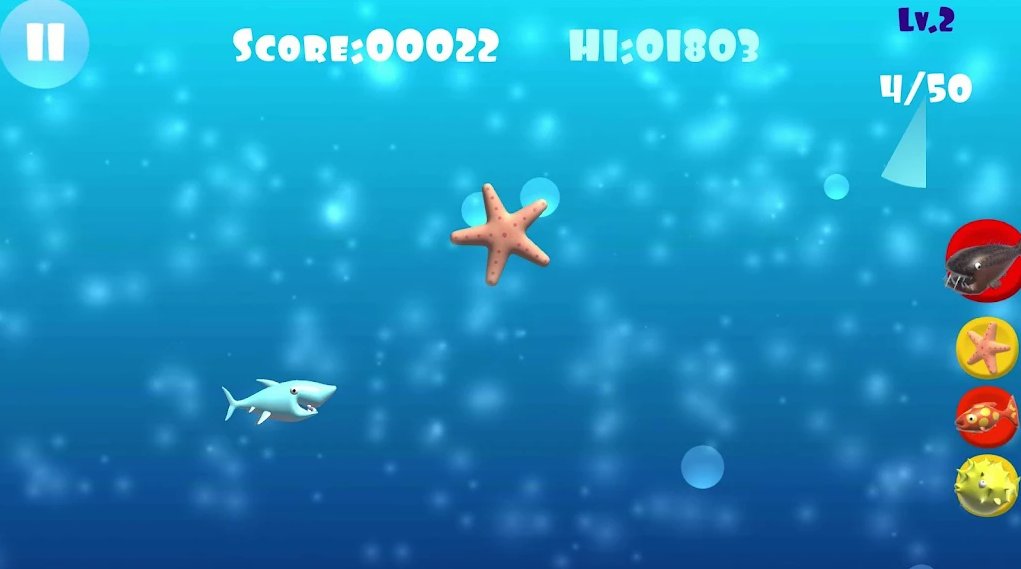 点击屏幕来控制鲨鱼避开大鱼,吃小鱼。鲨鱼吃足够的食物时,它会长大