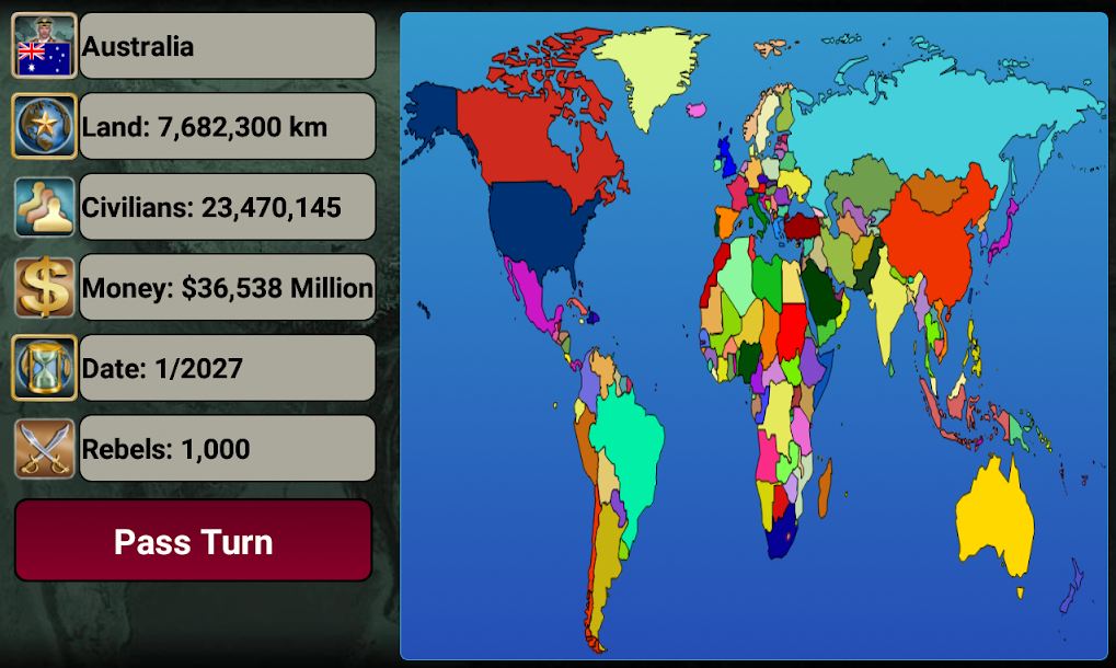 世界帝国2027是一款模拟战略战争的手游,在游戏中玩家可以选择不同的国家开始,每个国家都有不同的初始实力,你可以选择你想玩的国家开始战斗。充分发挥自己的军事才能,合理利用各种军事资源。