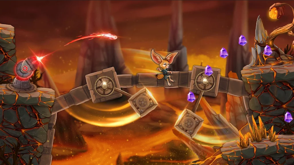 勇敢狐狸与古代之迷FinAncient Mystery是一款横版2D动作冒险游戏,帮助名为芬的勇敢狐狸穿越七个魔法平台世界,击败六个强大首领。掌握飞行、旋转、射击和打击来完成挑战,避开危险障碍,收集金币,找到隐藏的神器。