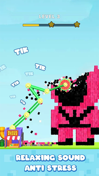 控制拆解机,将许多不同的喜欢的物体的所有方块推入地下,获得的方块越多,越富有