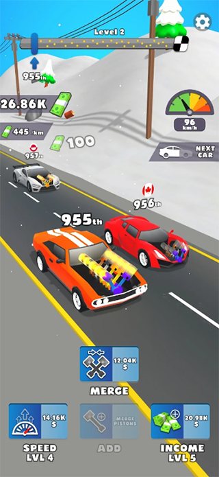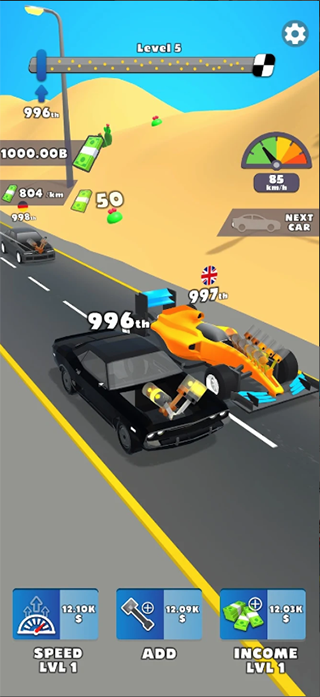 融合放置和合并玩法的赛车调查游戏,本质是不断追求更高的速度,超越所有的竞争对手