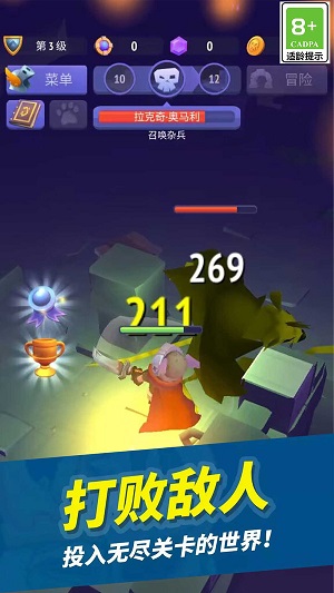 不断开始冒险,地牢中的怪物会出现并且攻击你,你需要利用你的能力,不断打败敌人。